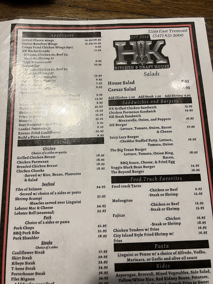 Located in the Bronx, HK Kitchen & Draft House offers a diverse bar and grill menu featuring a variety of appetizers, sandwiches, burgers, entrées, and beverage options. The menu is structured to provide choices suitable for casual dining throughout the day, including lunch, dinner, and social gatherings.